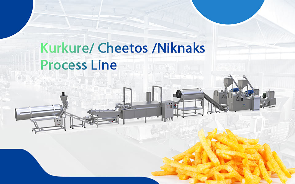 Los Kurkure/Cheetos son un tipo de snack extruido conocido por su textura crujiente y su delicioso sabor.Se crean mediante un proceso de extrusión especial, en el que la sémola de maíz se mezcla con agua en una mezcladora de harina y luego se introduce en una extrusora de cabezal giratorio.En la extrusora, a la sémola de maíz se le da forma de rizos frotando dos placas giratorias y luego se corta a la longitud deseada con cuchillas cortadoras.