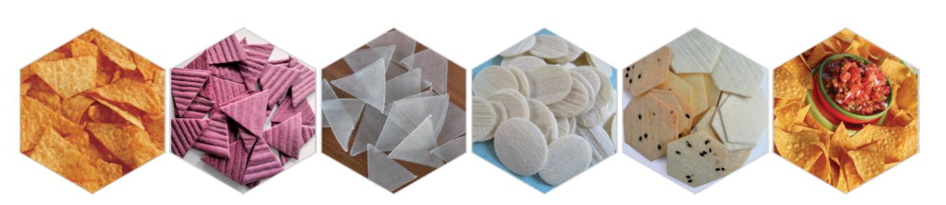 Los Doritos/Tortilla/Corn Chips son una especie de snacks elaborados a base de polvo de maíz, que se extrusionan, cortan y luego se fríen.Las principales materias primas son maíz en polvo, agua, aceite vegetal y sal.Aunque generalmente están hechos de maíz amarillo (como se muestra en la imagen), también pueden estar hechos de maíz blanco o rojo o harina de trigo.Después de freír y aromatizar, obtenemos chips triangulares u otras formas muy crujientes que son populares entre niños y adultos.