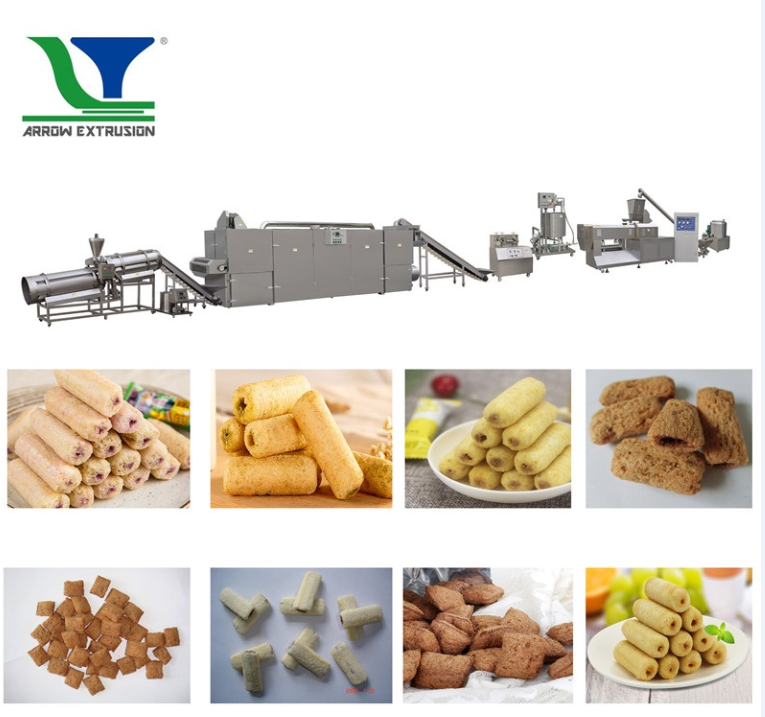 La extrusora de doble tornillo hace los panecillos y pasteles huecos, la máquina llenadora inyecta rellenos de diferentes sabores como crema, chocolate y mantequilla de maní para lograr que la coextrusión le dé a la comida inflada un sabor más rico;