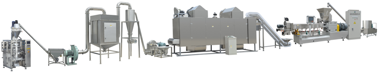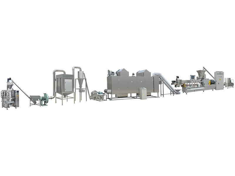 Nuestra empresa adopta la tecnología de expansión de doble tornillo y puede brindar soluciones desde 100 kg/h hasta 2-3 T/h.La principal materia prima del polvo nutricional en China es la harina de arroz;Mientras que para el extranjero, especialmente los países africanos, a menudo se agrega harina de soja como suplemento proteico.
